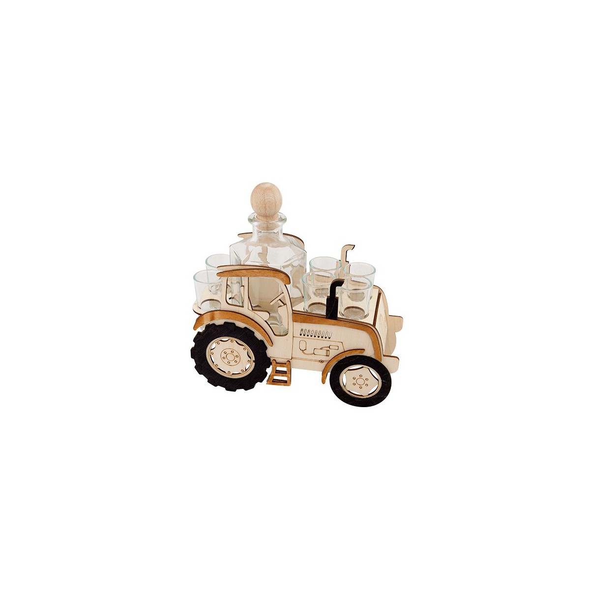 Darček pre poľnohospodára? Týmto darčekom mu isto vyčarujete úsmev na tvári. Milá imitácia traktora a v nej pekná 6hranná fľaška s dreveným vrchnákom spolu so šiestimi štamperlíkmi.