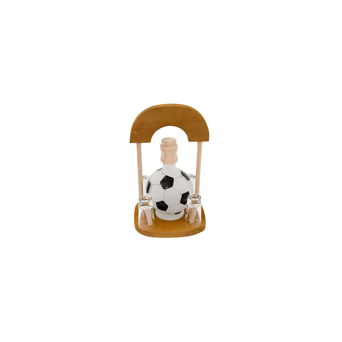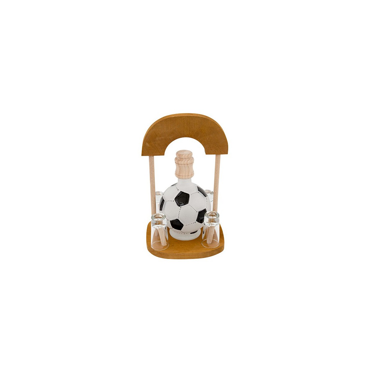 Veľmi pekná klasika, fľaša v tvare futbalovej lopty s dreveným vrchnákom a štyrmi štamperlíkmi zahreje srdce každého futbalistu.