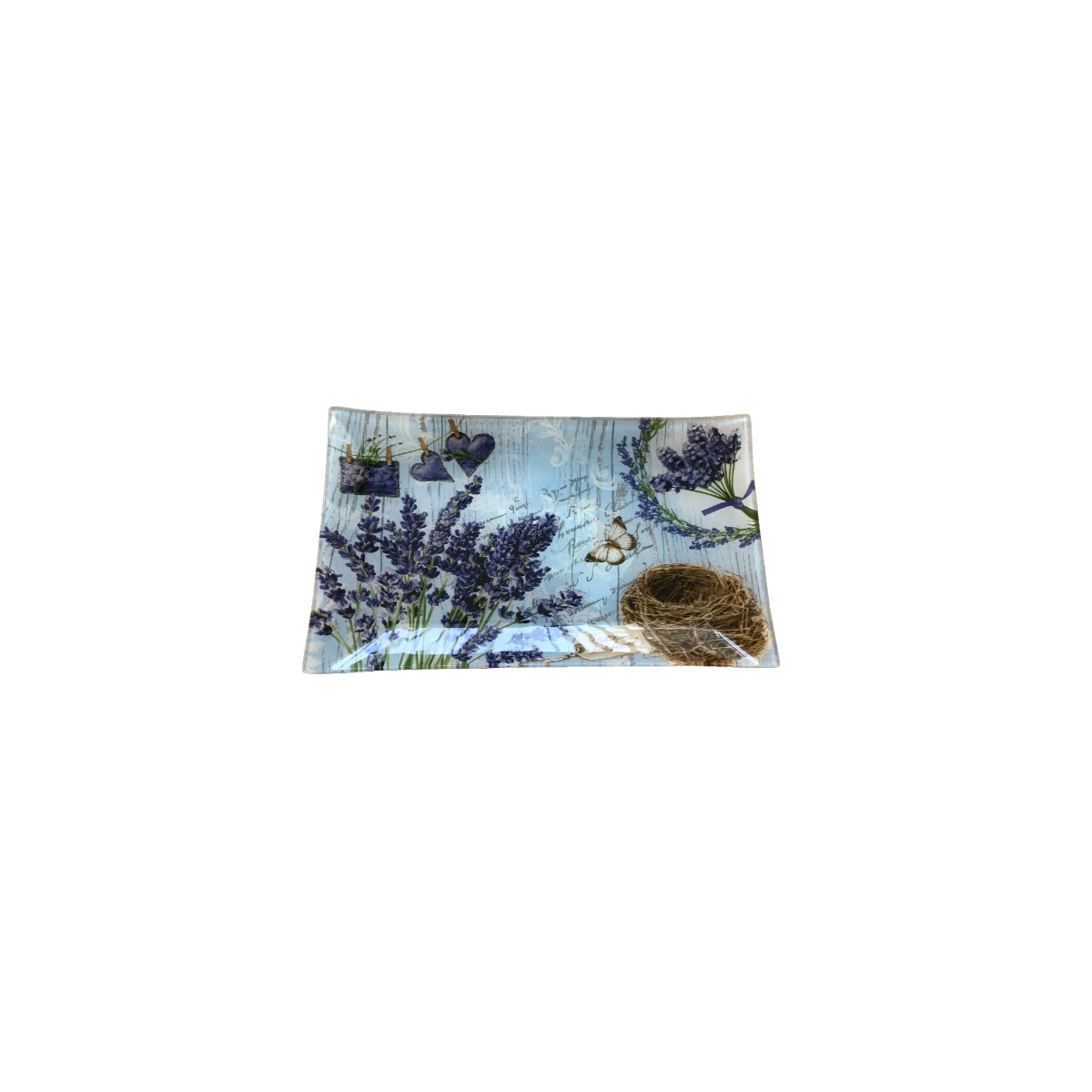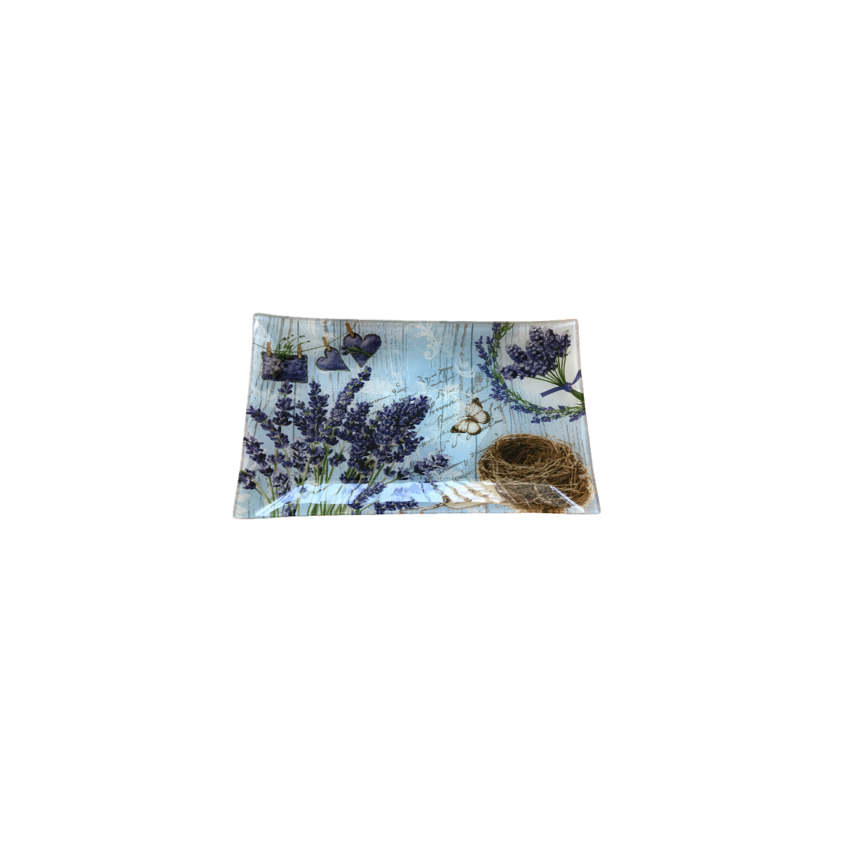 Krásna tácka zo série našich sklenených servírovacích podnosov so vzorom levandule.