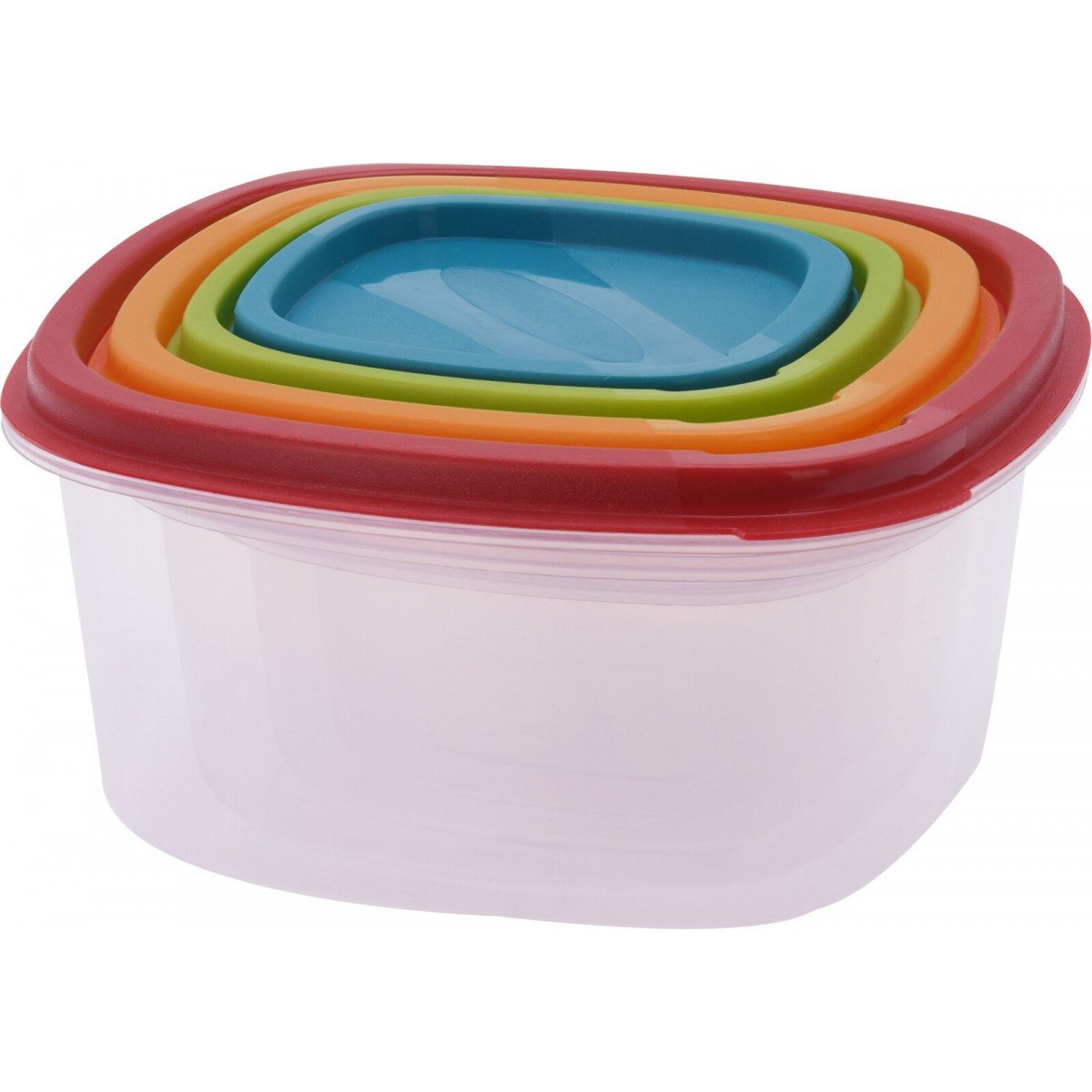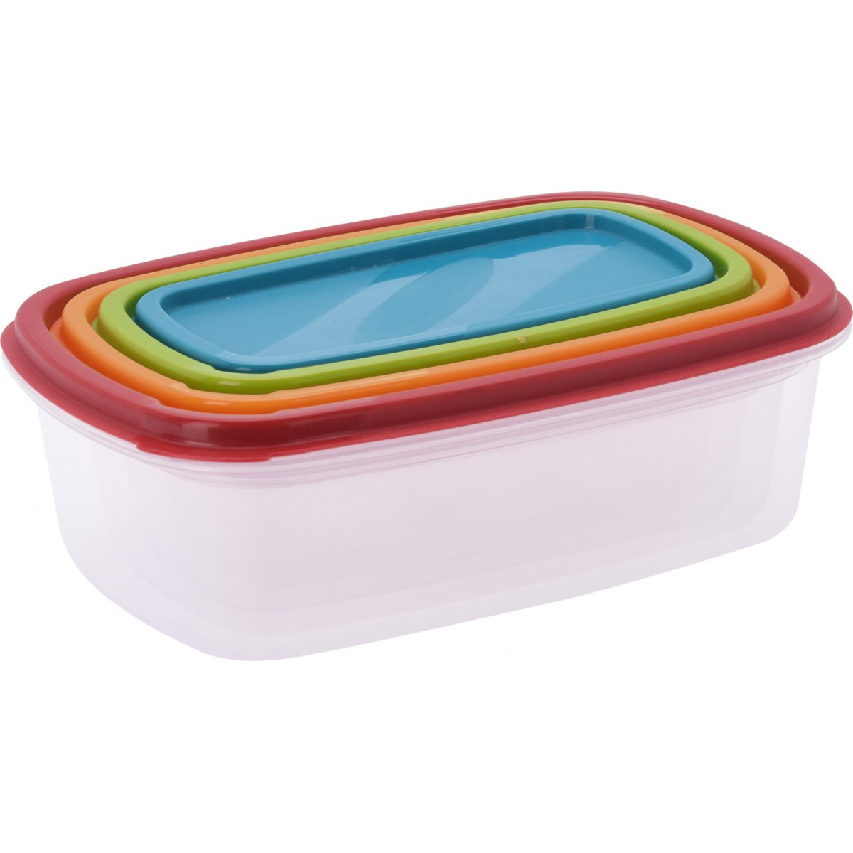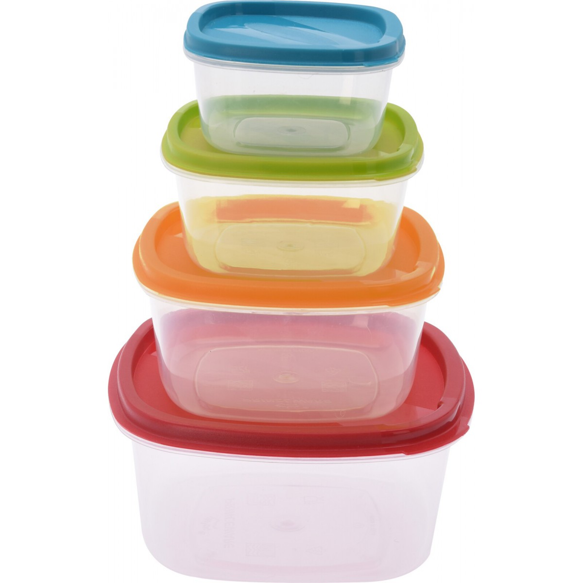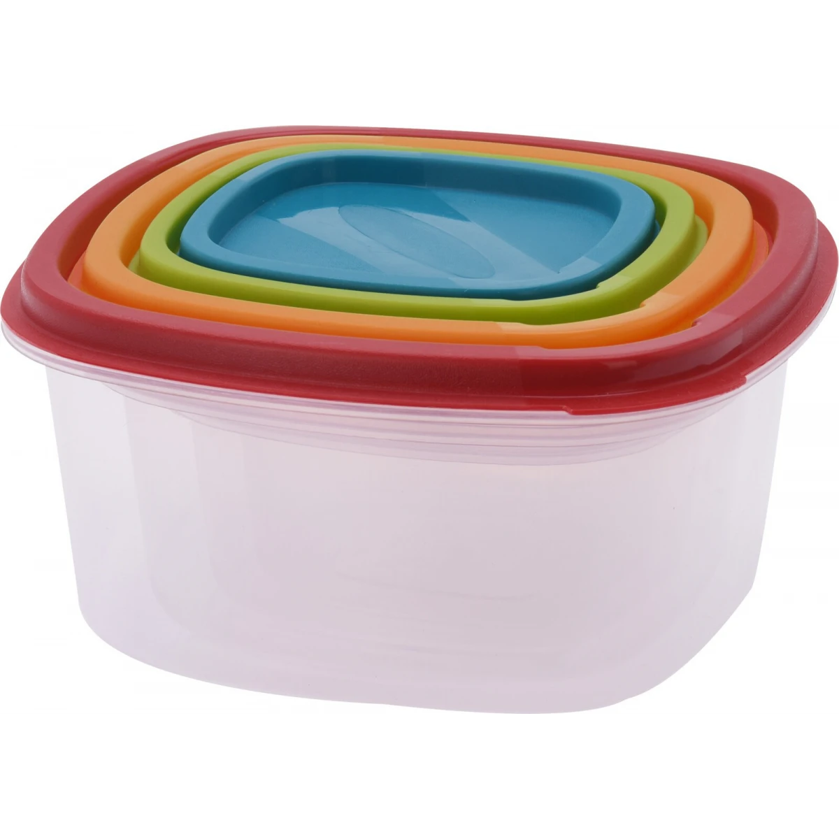 Súprava 4 úložných dóz pre uskladenie potravín. Sada dóz je dostupná v dvoch tvaroch (štvorcový / obdĺžnikový). Dózy sú priehľadné a s farebným vekom.