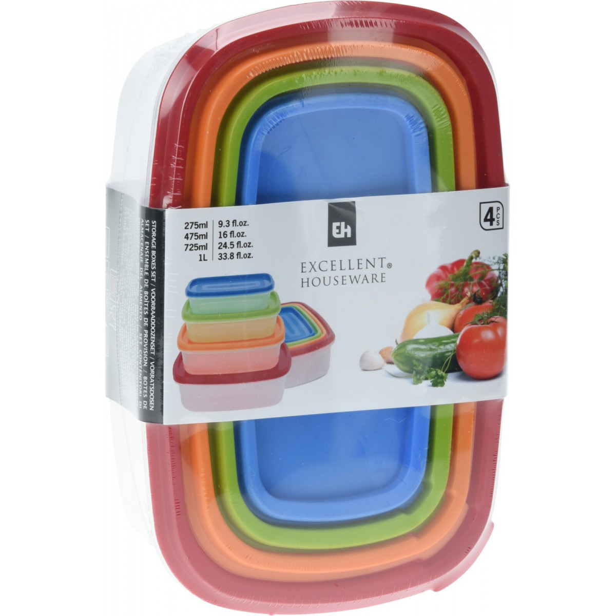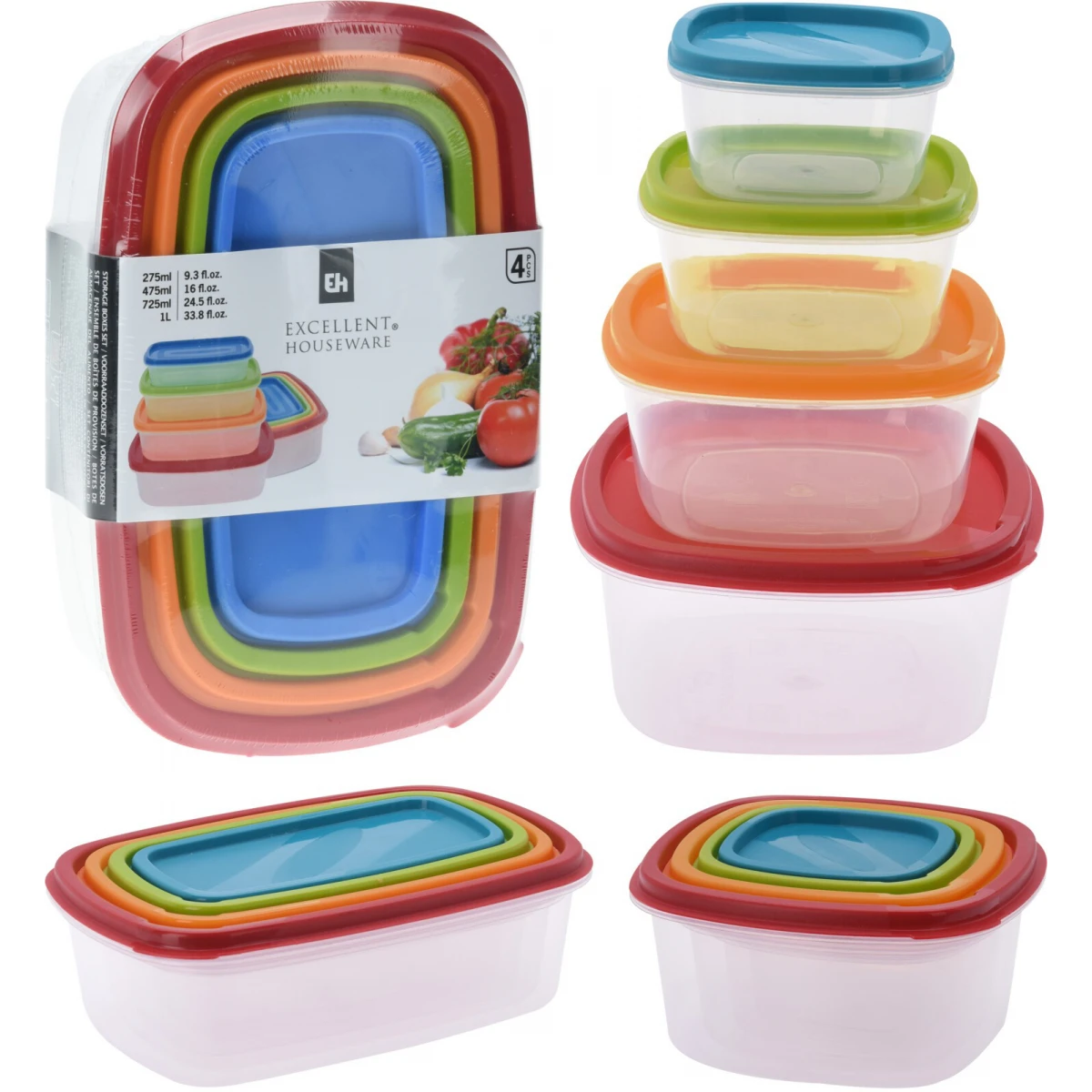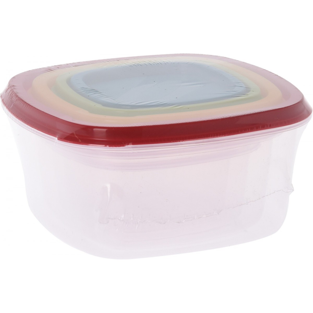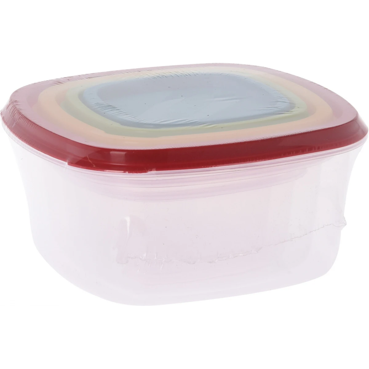 Súprava 4 úložných dóz pre uskladenie potravín. Sada dóz je dostupná v dvoch tvaroch (štvorcový / obdĺžnikový). Dózy sú priehľadné a s farebným vekom.