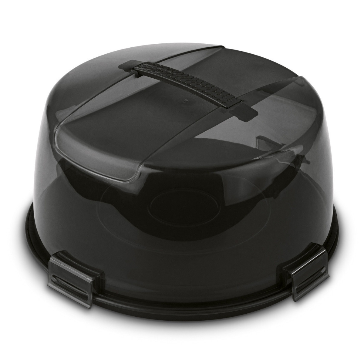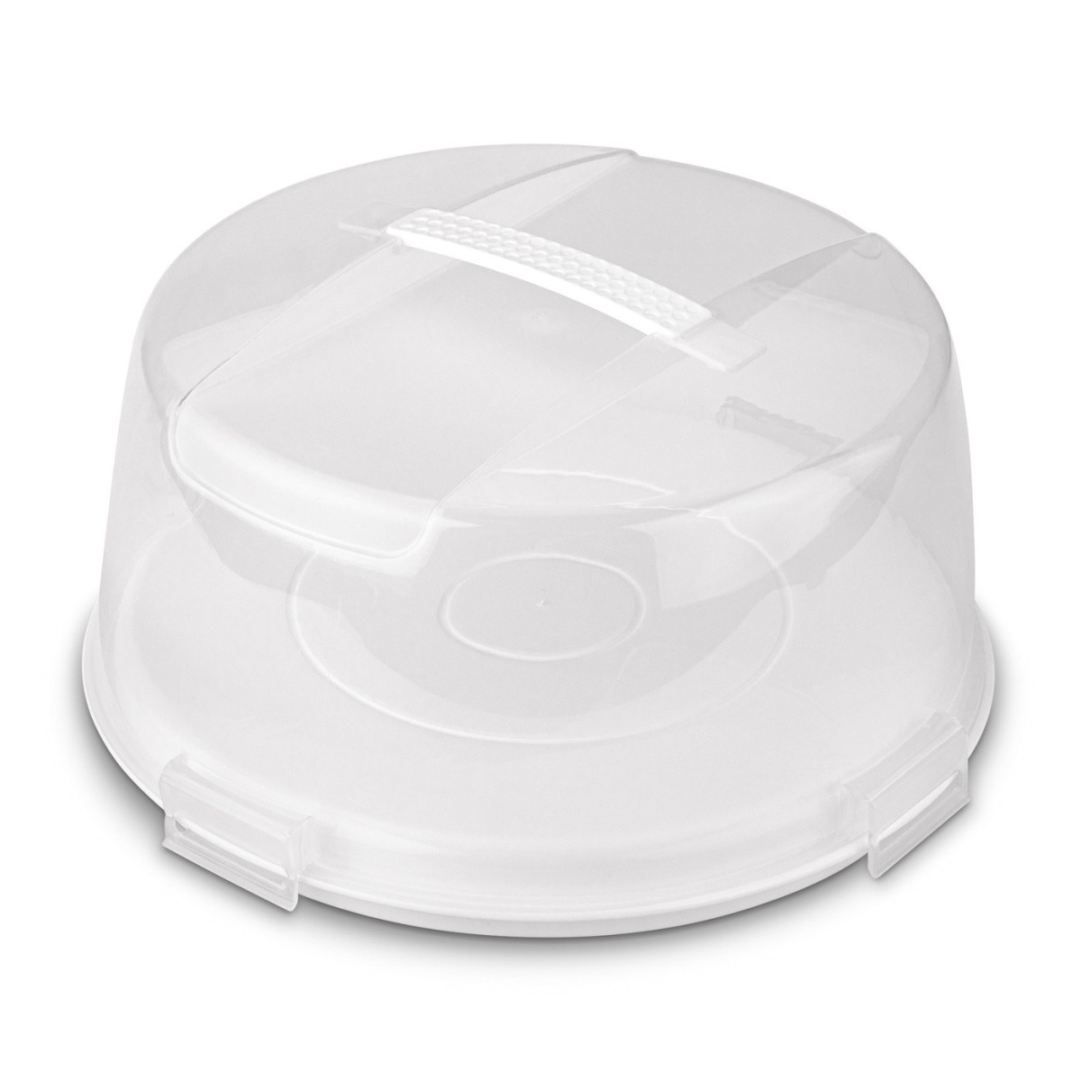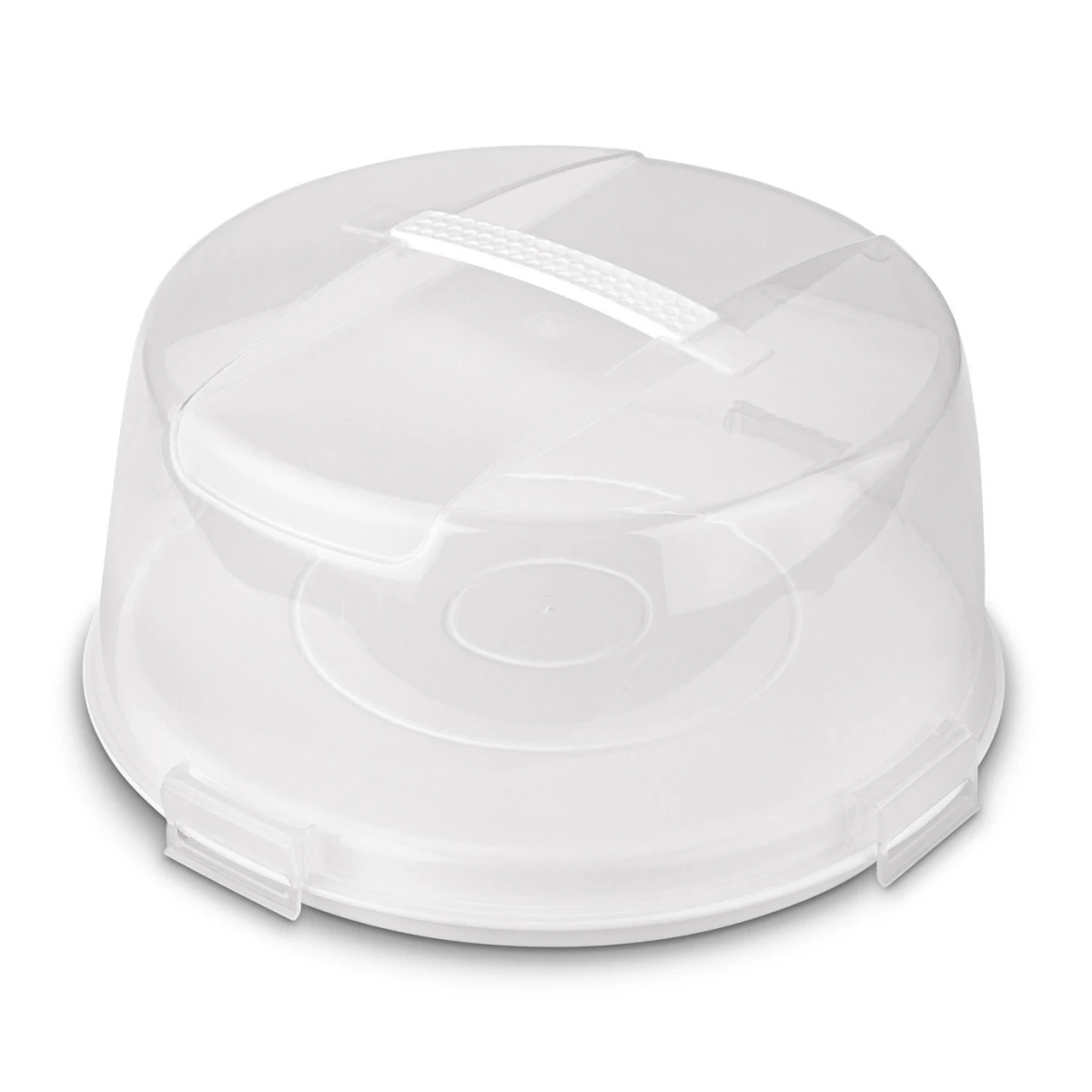 Okrúhly tvar a vyrobené z odolného plastu Priehľadné veko pripevnené klipmi Vstavaná rukoväť pre pohodlné prenášanie nádoby Podstavec, ktorý môže nahradiť tortu alebo stojan na tortu,- vnútorné rozmery: 26,5 x 10 cm
