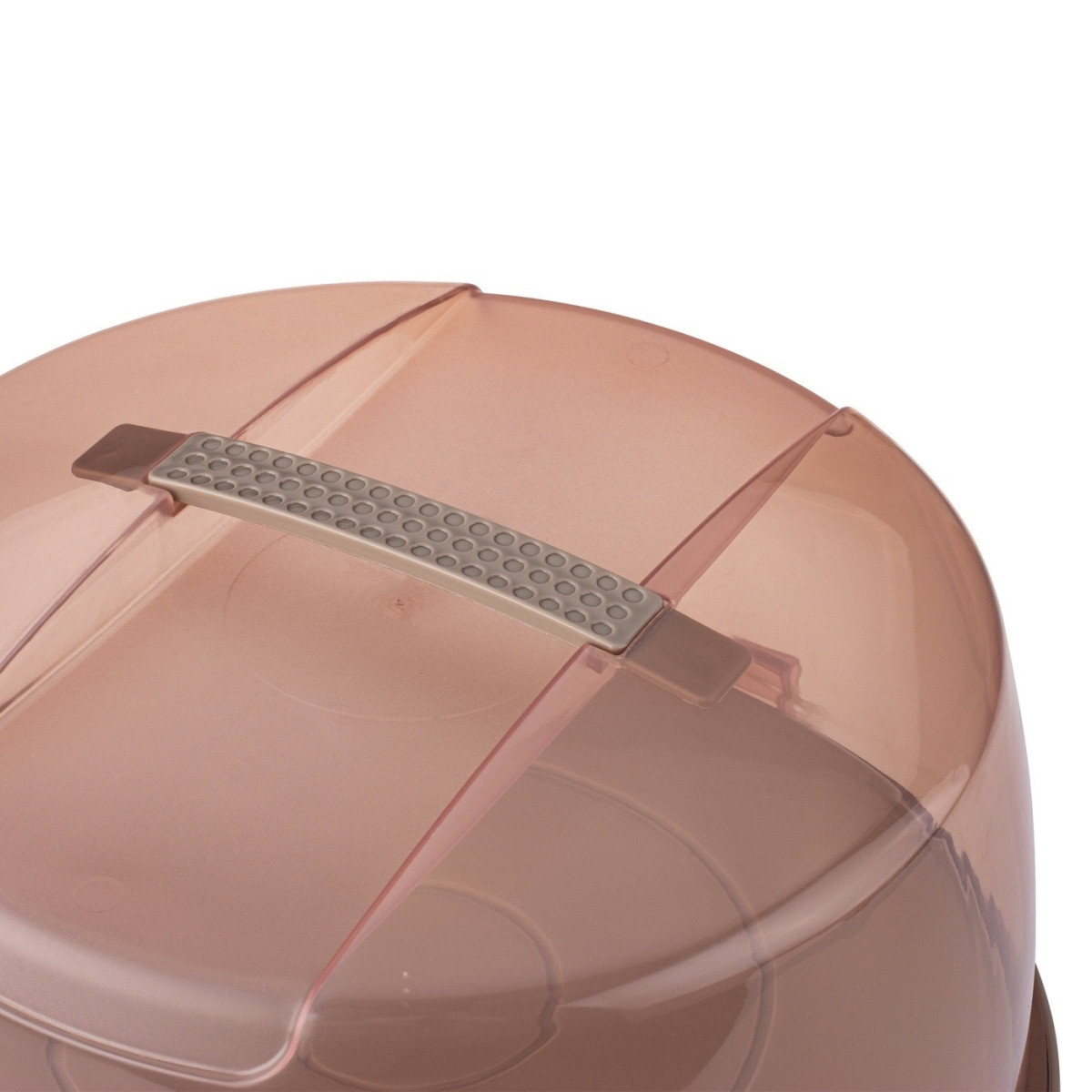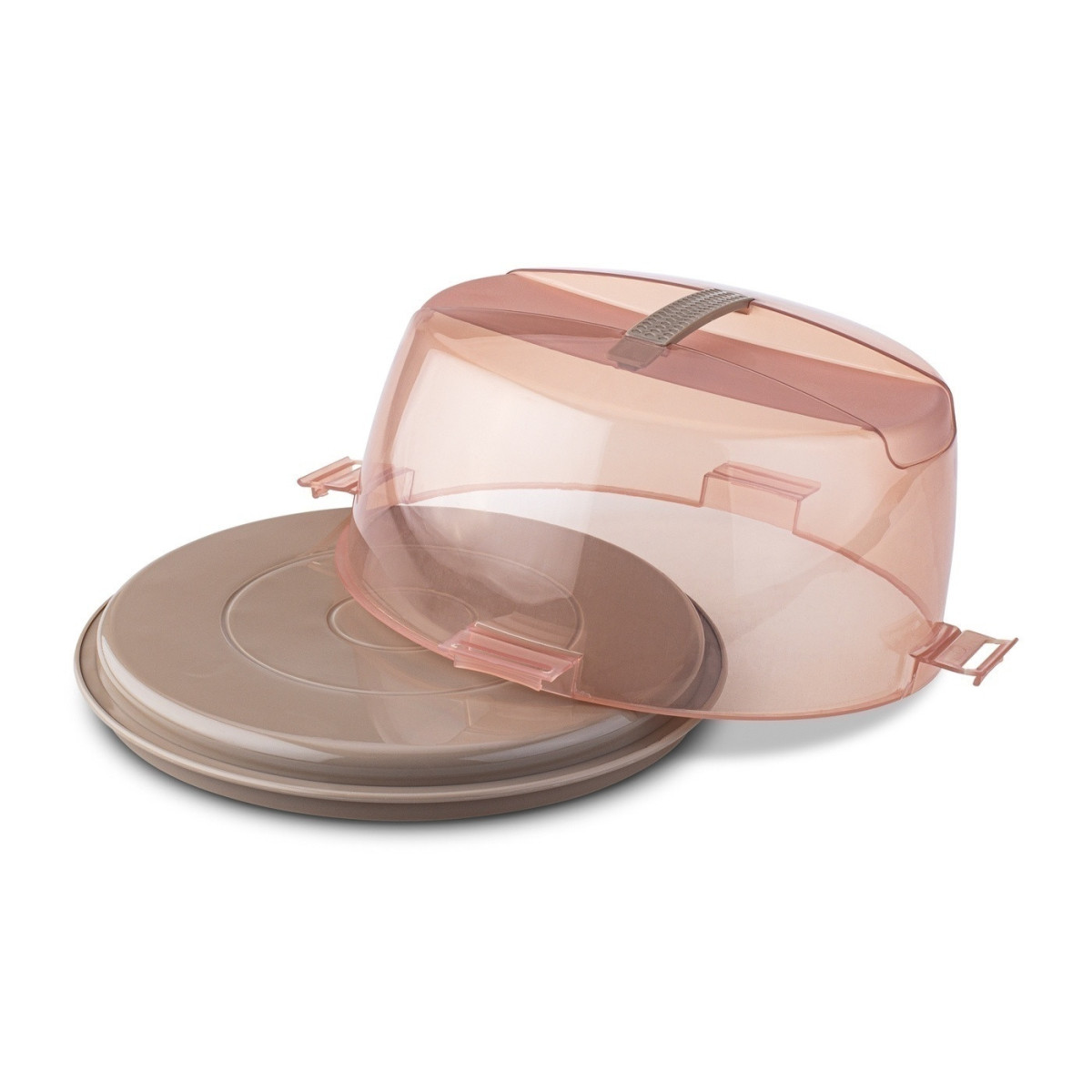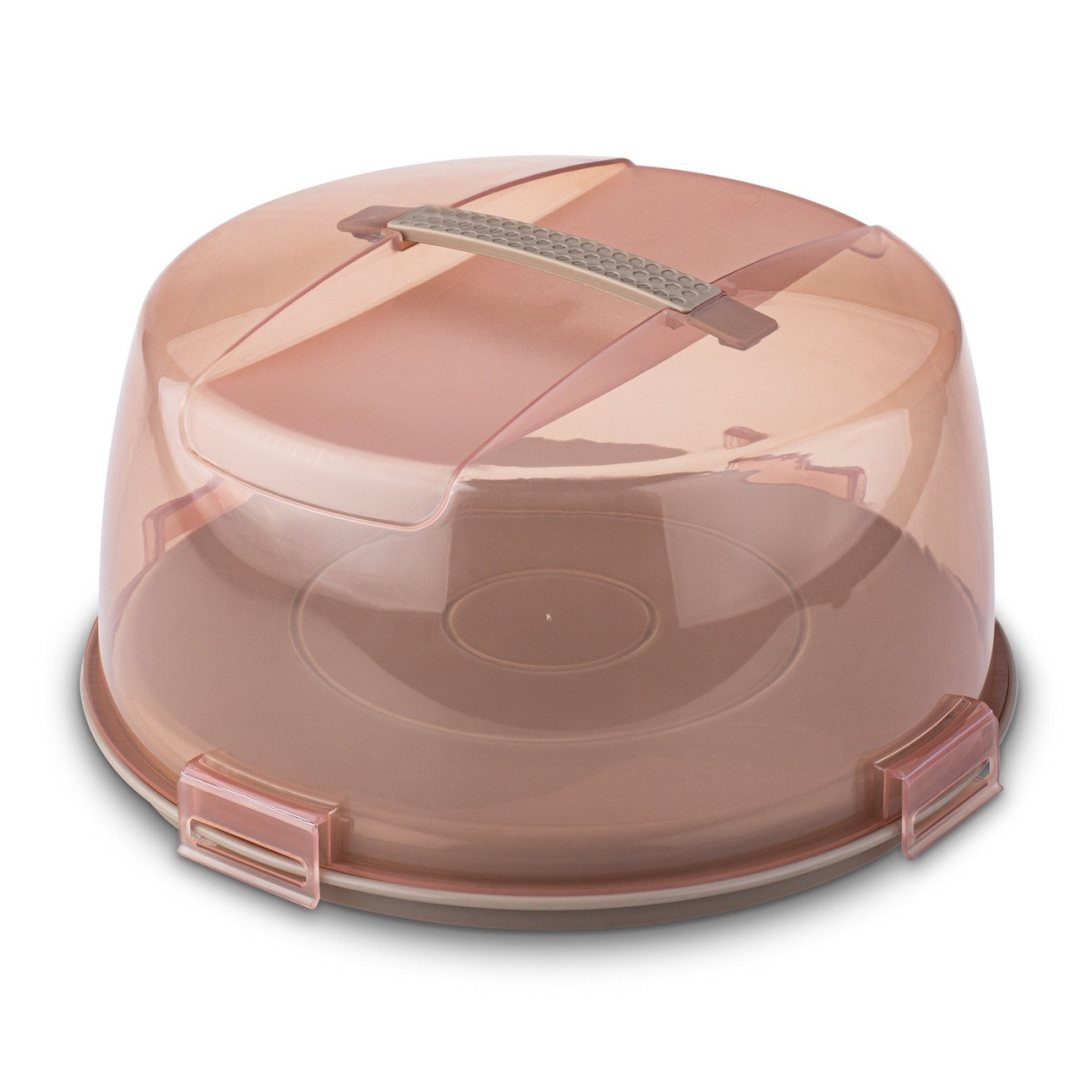Okrúhly tvar a vyrobené z odolného plastu Priehľadné veko pripevnené klipmi Vstavaná rukoväť pre pohodlné prenášanie nádoby Podstavec, ktorý môže nahradiť tortu alebo stojan na tortu,- vnútorné rozmery: 26,5 x 10 cm