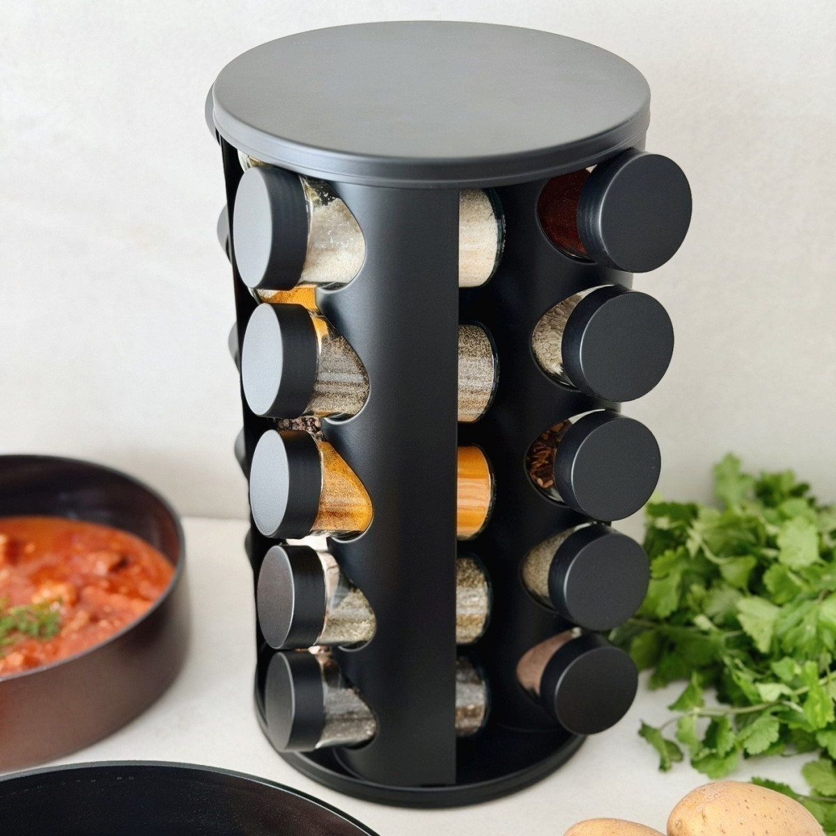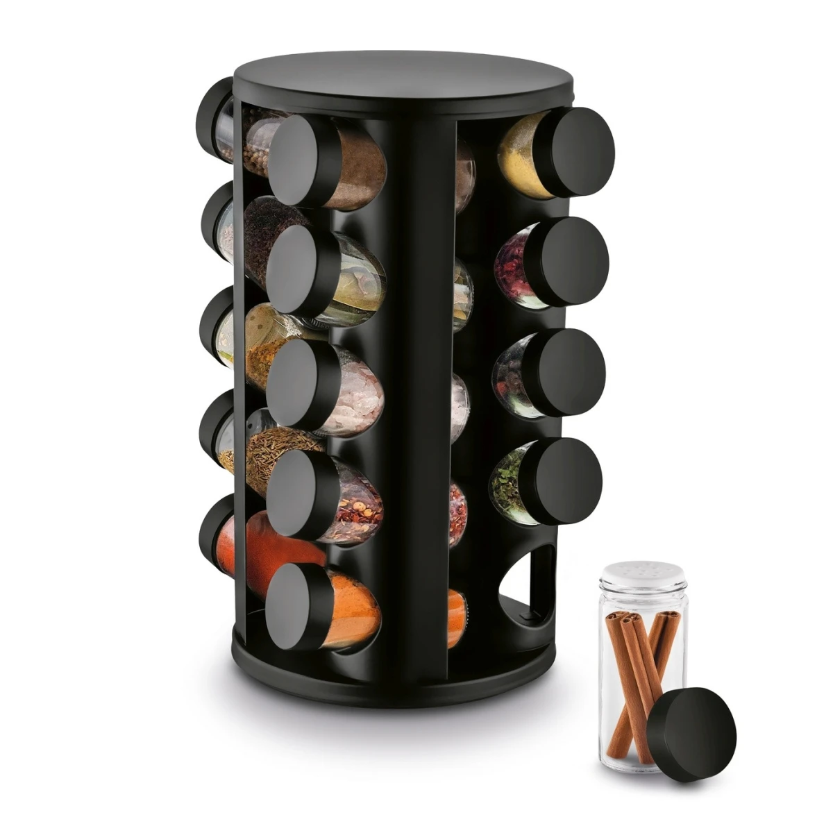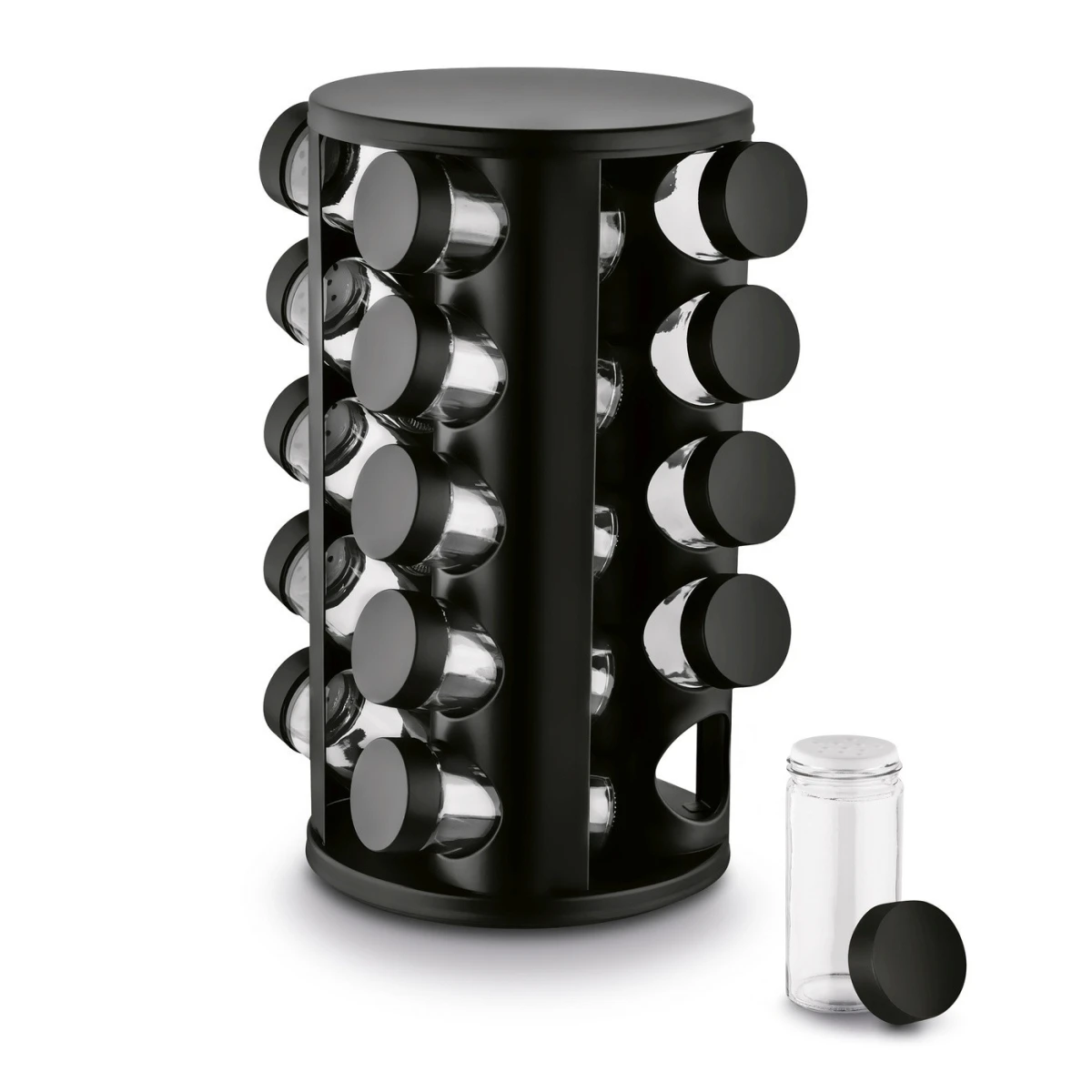 - stojan z nehrdzavejúcej ocele, saténová povrchová úprava- otočná základňa stojana- rozmery stojana: 17 x 17 x 20 cm- sklenené nádoby s bielym plastovým krytom a oceľovým viečkom-...