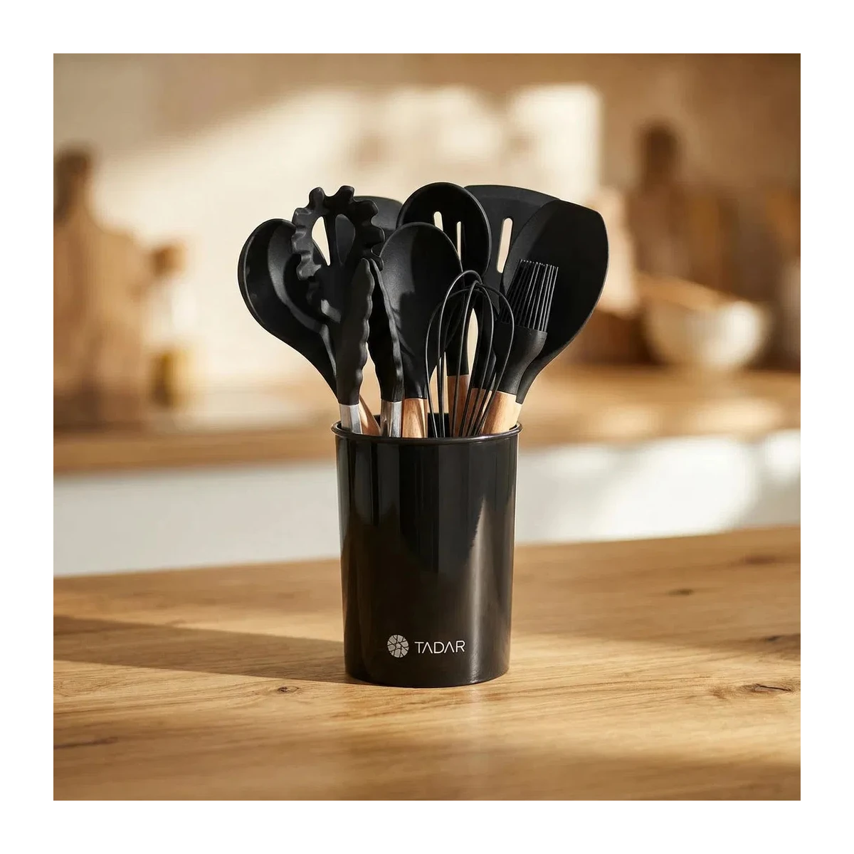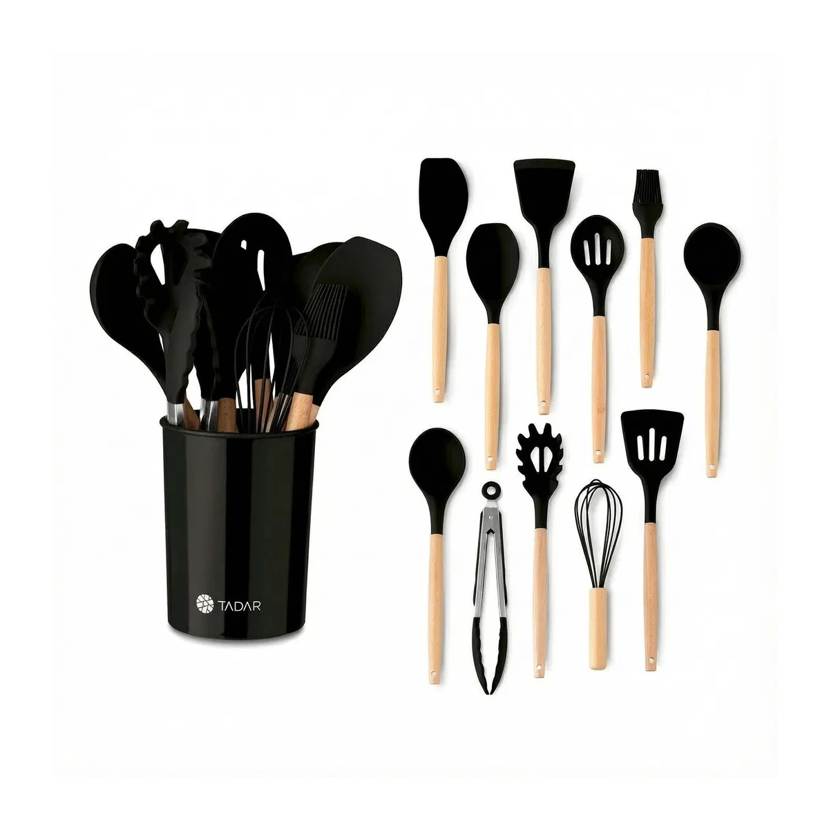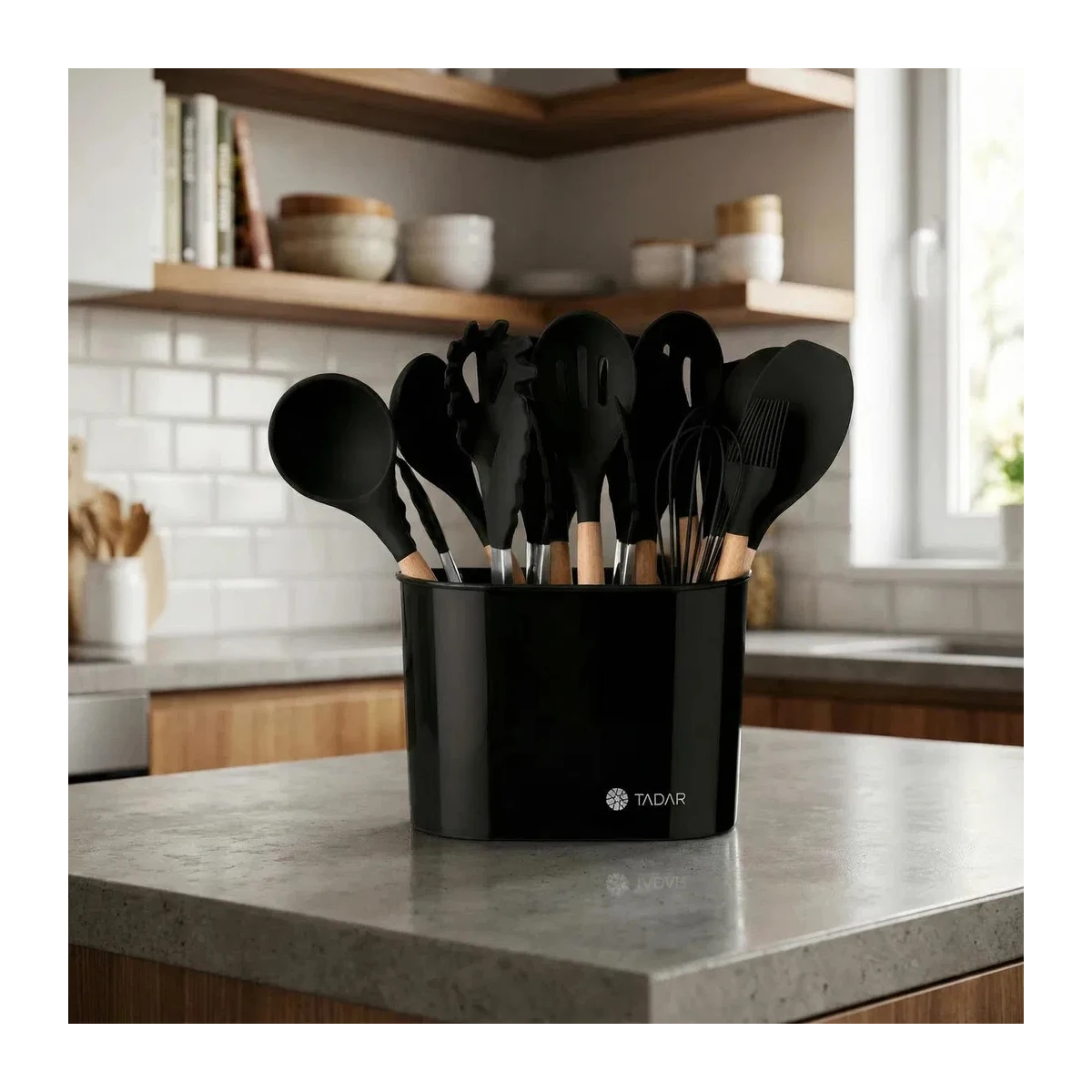 Rúčky riadu sú vyrobené z prírodného materiálu, bambusového dreva. Pracovná plocha príslušenstva je vyrobená z flexibilného silikónu v tmavošedej farbe. Sada obsahuje farebne zladený stojan na uskladnenie a umiestnenie na kuchynskej linke. Možnosť zavesiť príbor na zábradlie vďaka otvorom v rukovätiach Tepelná odolnosť použitého silikónu je od -20 do 220 stupňov Celzia