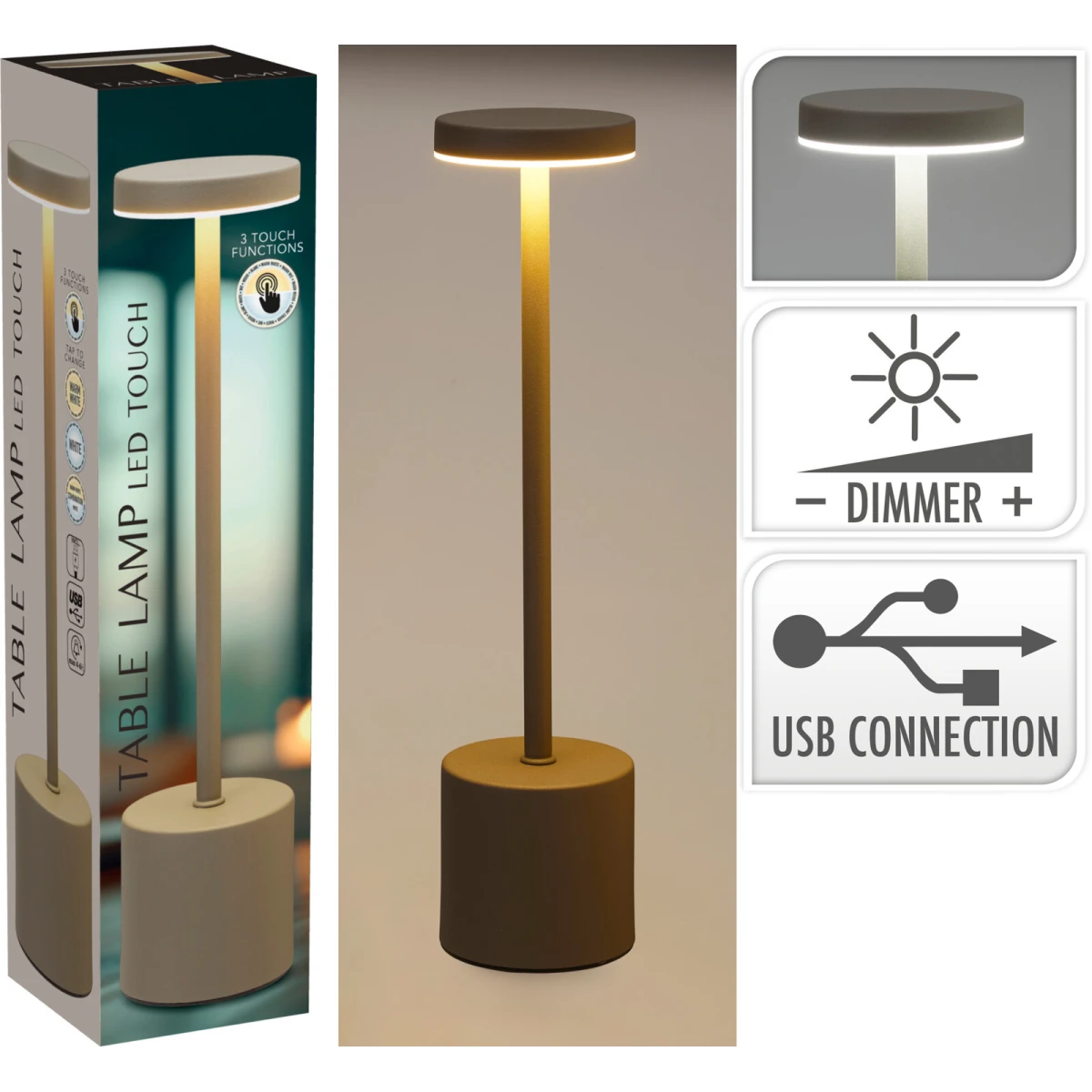 LED stolná lampa s dobíjacou batériou, kov, 34 cm