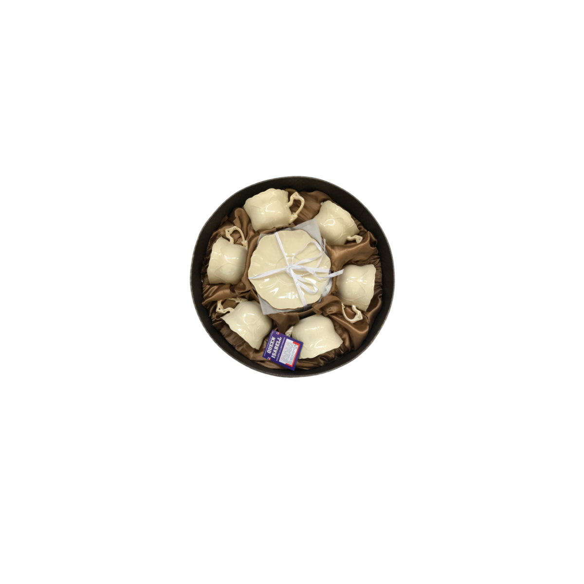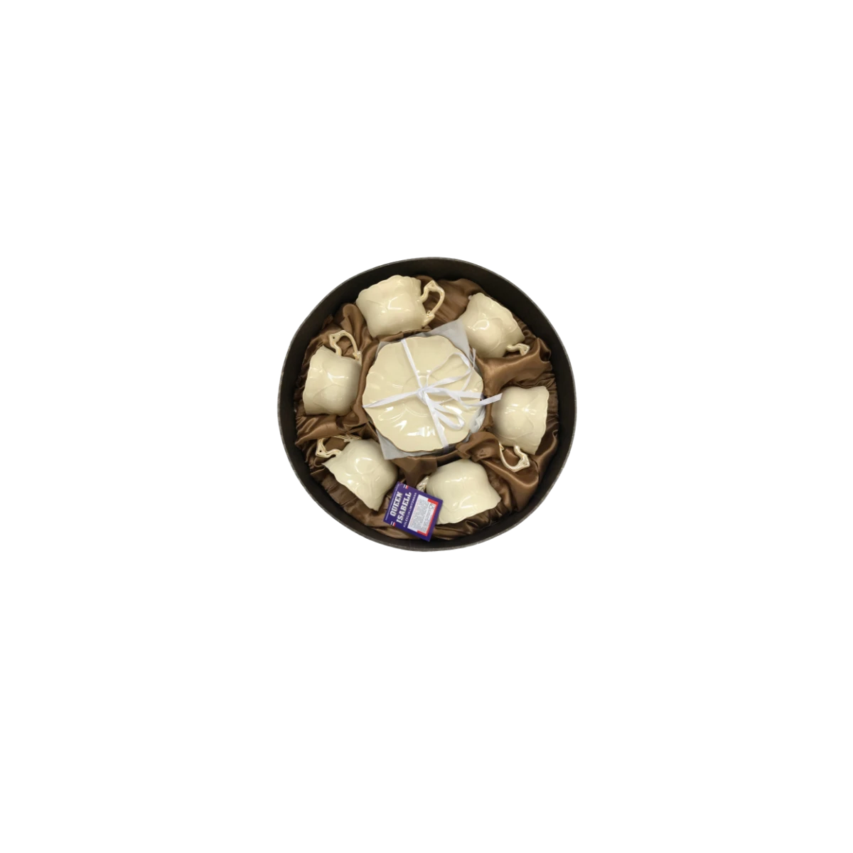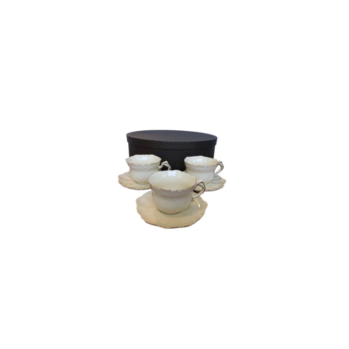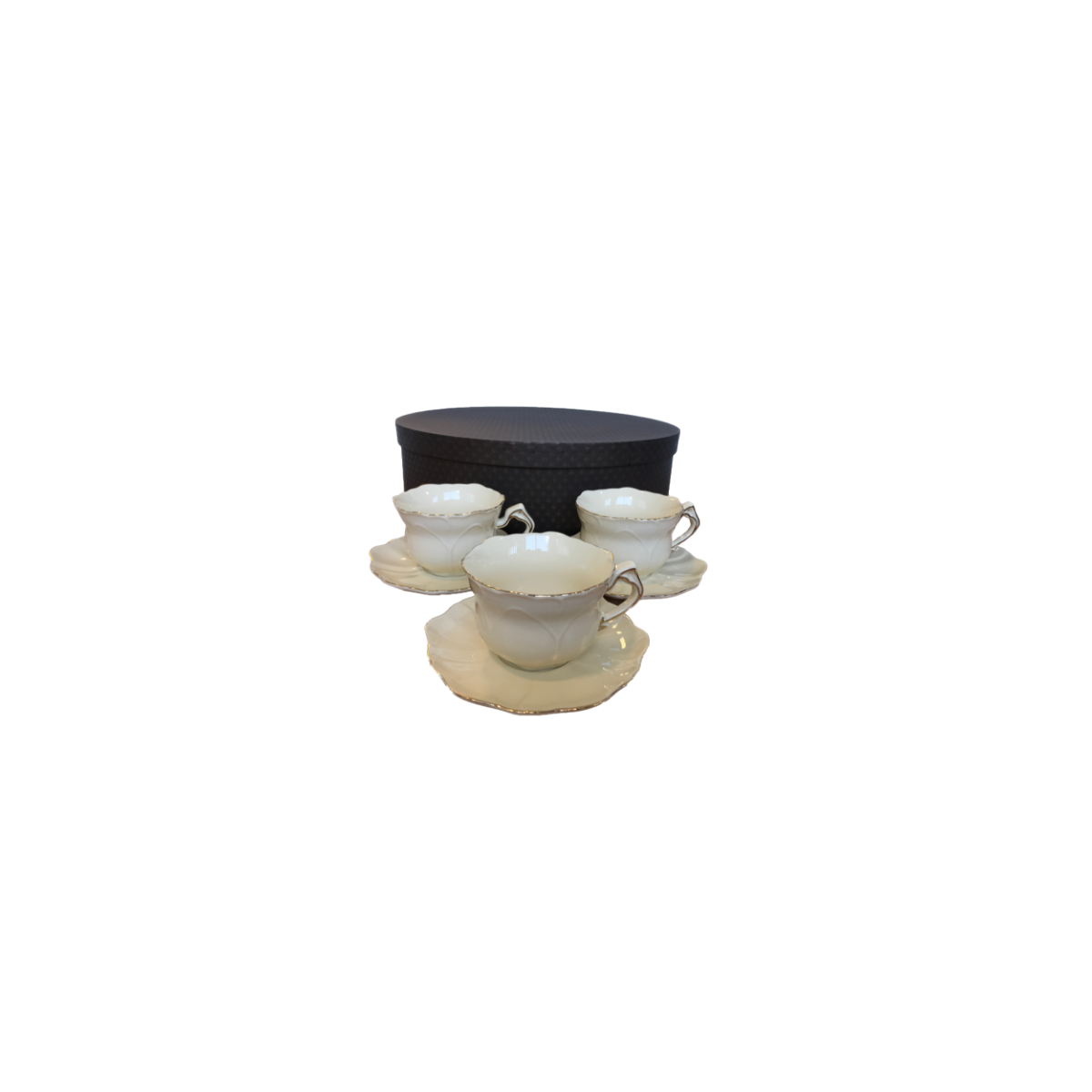Porcelánová sada dvoch šálok s podšálkami v darčekovom balení. Šálky aj tanieriky majú po obvode zlatý pásik.