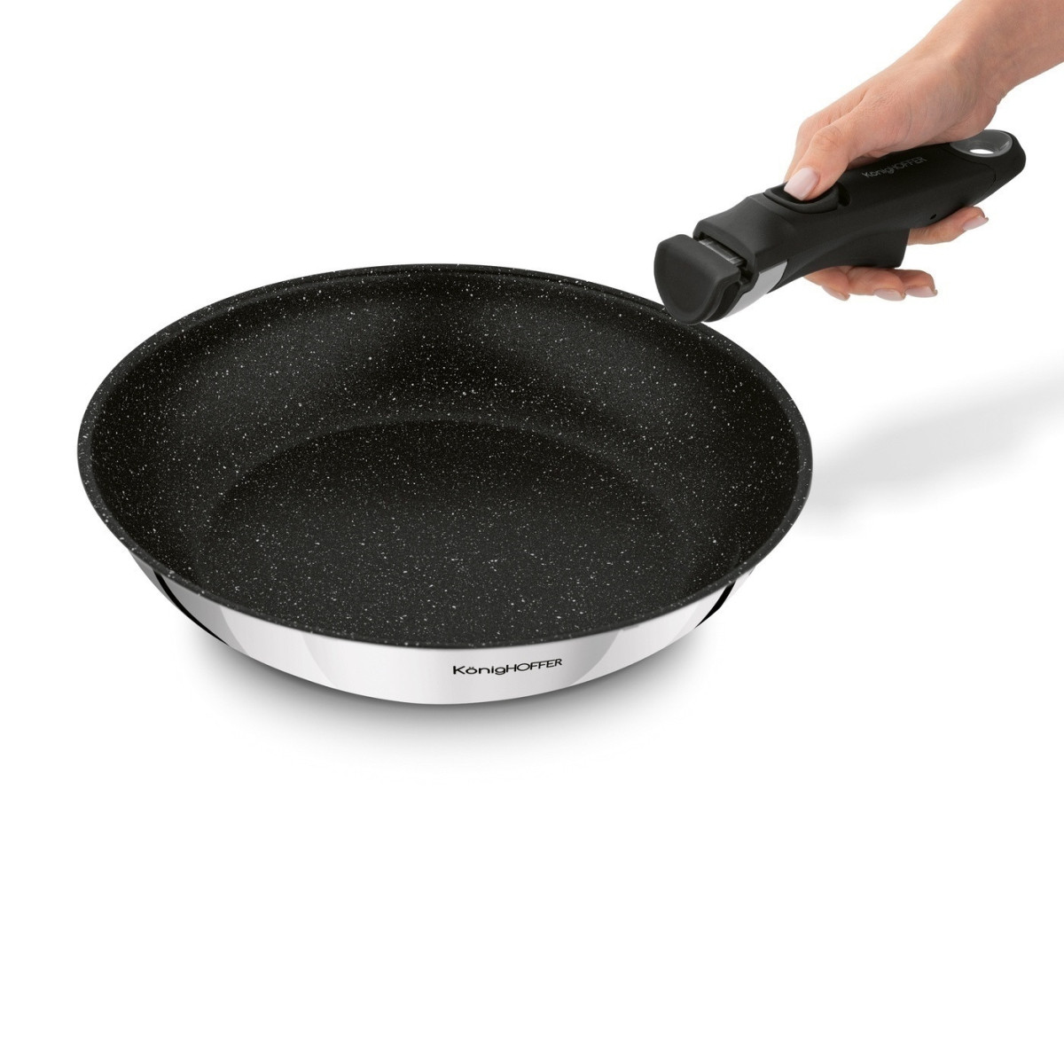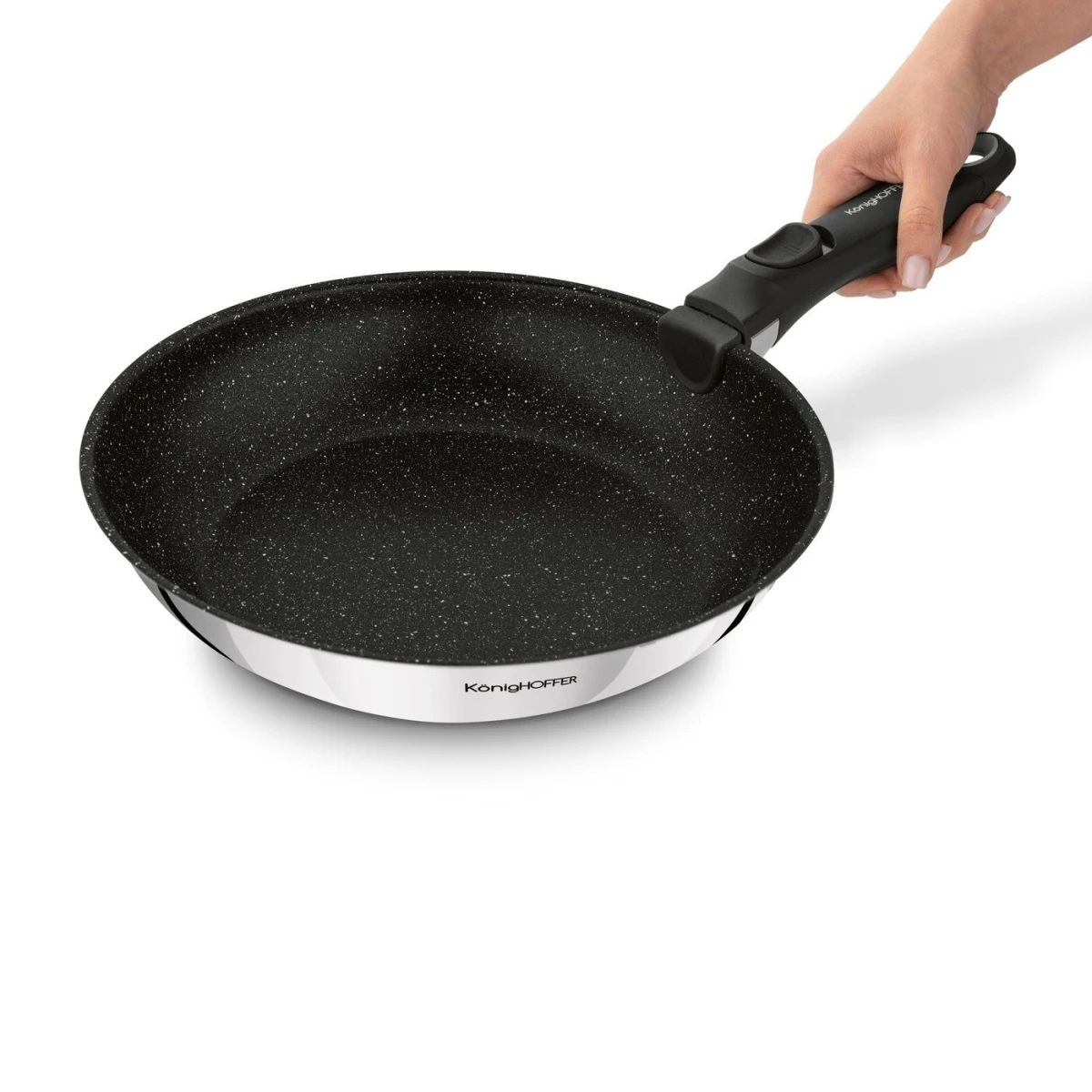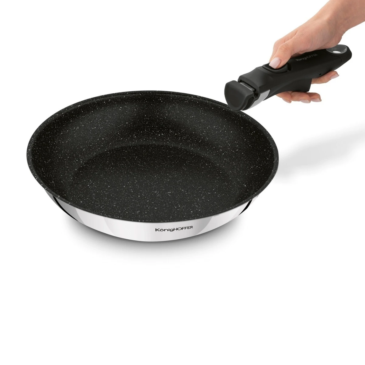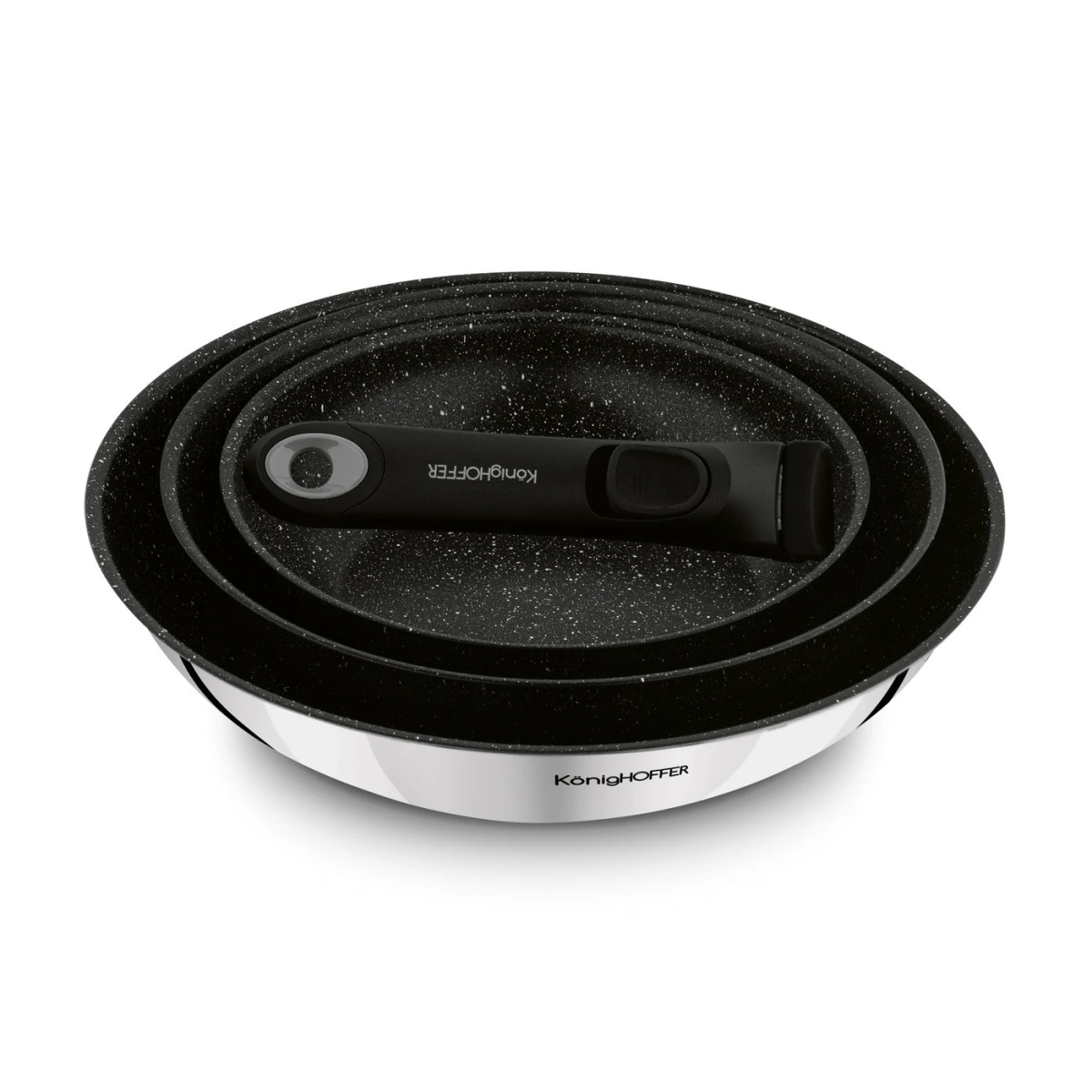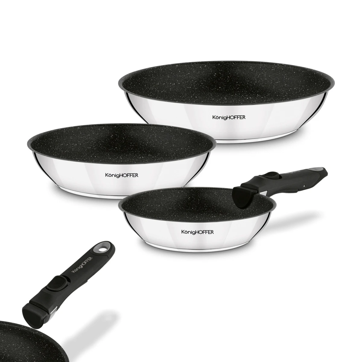 Pevná konštrukcia telies riadu z odolnej nehrdzavejúcej ocele Vnútorná strana panvice je pokrytá tvrdeným nepriľnavým povlakom (odolný mnohým cyklom oderu!) Energeticky úsporné dno vhodné na vyprážanie na akomkoľvek type sporáka Univerzálna a odnímateľná rukoväť je súčasťou balenia pre jednoduchšie skladovanie Tri rôzne priemery panvíc a jednoduchá údržba súpravy
